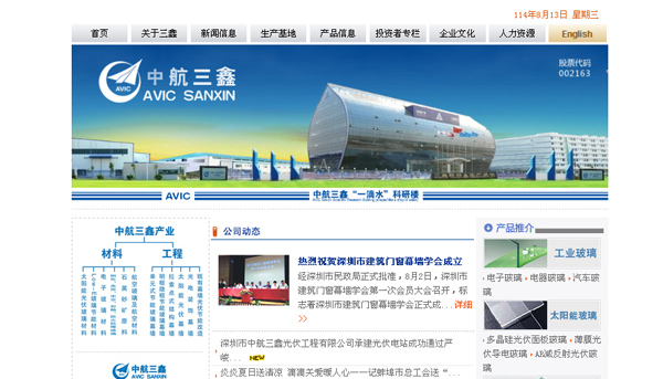 中航三鑫股份有限公司,前身為“深圳市三鑫特種玻璃技術股份有限公司”,是中國航空工業(yè)集團公司旗下企業(yè)。公司創(chuàng)辦于1995年6月,經(jīng)過十幾年的發(fā)展,于2007年8月在深圳證交所A股上